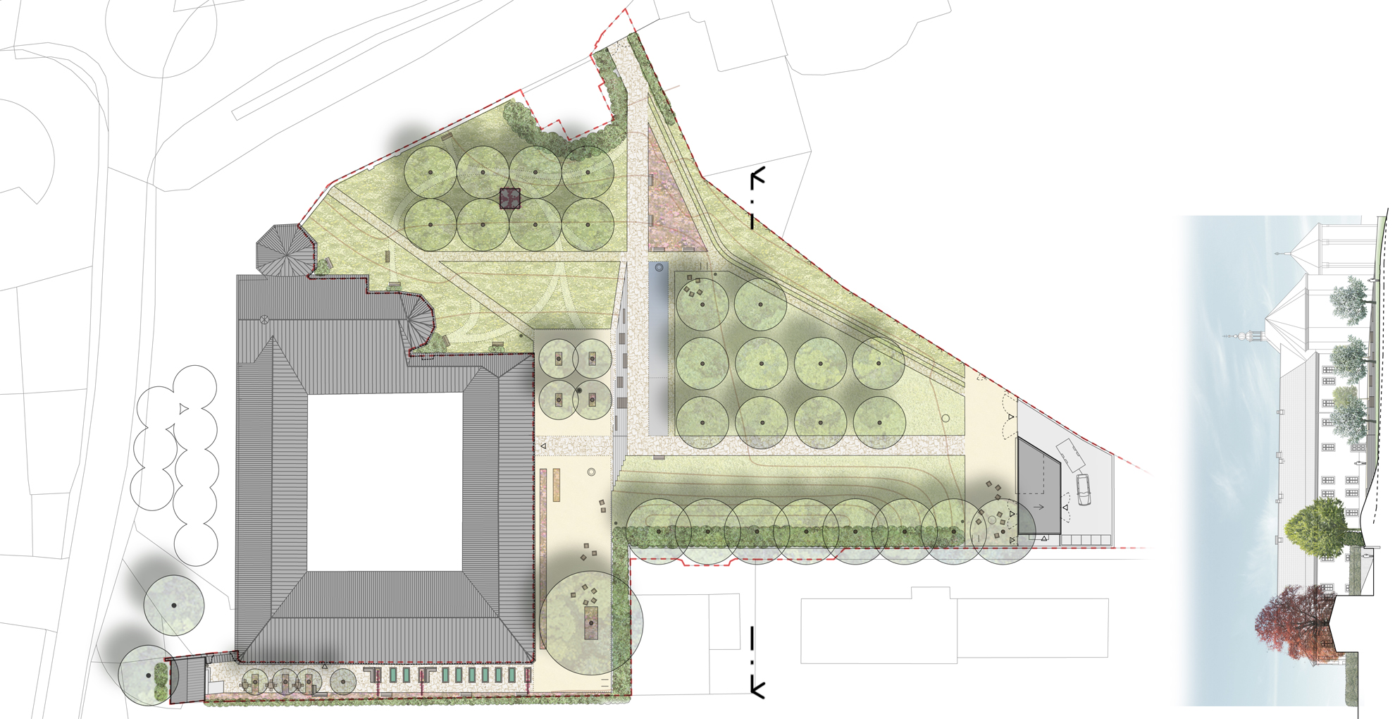 Klášter slouží lidem, stal se nositelem kultury. Cílem projektu je navrátit klášteru ztracenou zahradu, alespoň její část, a otevřít ji lidem. Návrh vnáší historický charakter zahrady pomocí soudobých výrazových prostředků a doplňuje výsadby o nové provozní objekty a umělecká díla.